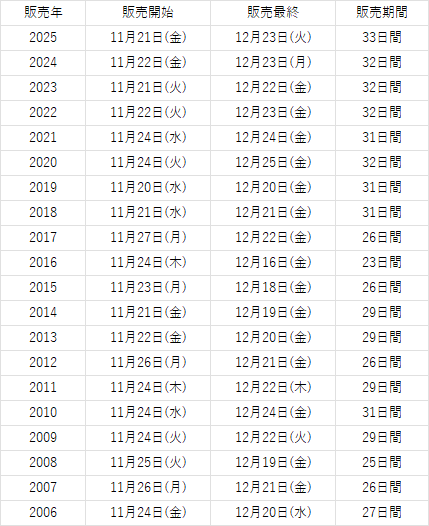 次に開始日です。過去数年の販売期間は概ね31~32日間で推移しているため、終了日から逆算すると発売開始日はおおむね11月18日〜11月19日のどちらかに絞られます。さらに暦や祝日の並び(勤労感謝の日が11月23日であること等)を照らし合わせると、購入者の動きを考慮して週の中盤に開始するケースが多いので、2026年は11月24日(火)開始が最も妥当と予想できます。また、これも2020年の販売スケジュールと重なります。従って現時点では「2026年11月24日開始/12月25日終了」を有力な予想日程として挙げておきます。